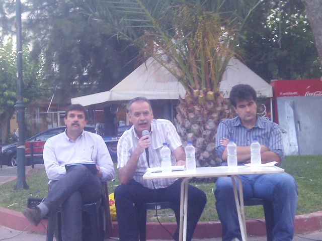 Ομιλητές ήταν ο Ανδρέας Ξανθός, γιατρός, βουλευτής Ρεθύμνου και υπεύθυνος ΕΕΚΕ Υγείας του ΣΥΡΙΖΑ-ΕΚΜ, ο Γιάννης Μπασκόζος, γιατρός, μέλος της συντονιστικής γραμματείας του ΣΥΡΙΖΑ-ΕΚΜ υπεύθυνος για την υγεία, η Φούλη Σαγγανά από την επιτροπή υγείας ΣΥΡΙΖΑ Δ. Αθήνας και ο Αλέξης Πουλιάσης, δημοτικός σύμβουλος και επικεφαλής της Δημοτικής Παράταξης «ενεργοί πολίτες για την ανατροπή στο Περιστέρι».