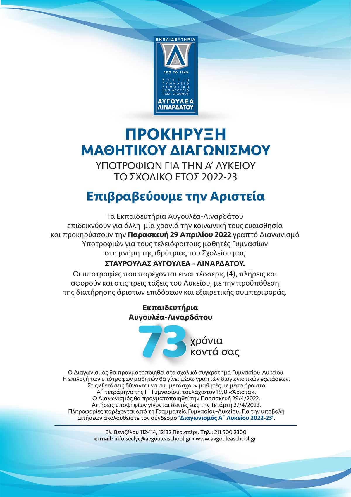 Τα Εκπαιδευτήρια που αποτελούν τον κορυφαίο εκπαιδευτικό οργανισμό στο Περιστέρι, επιδεικνύουν και πάλι την κοινωνική τους ευαισθησία προκηρύσσοντας την Παρασκευή 29 Απριλίου 2022 γραπτό Διαγωνισμό Υποτροφιών για τους τελειόφοιτους μαθητές Γυμνασίων στην μνήμη της ιδρύτριας του σχολείου, Σταυρούλας Αυγουλέα-Λιναρδάτου.