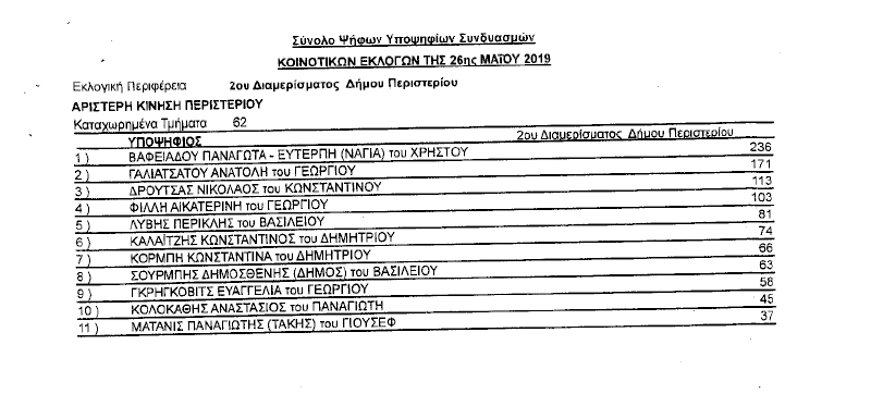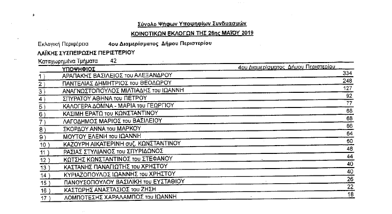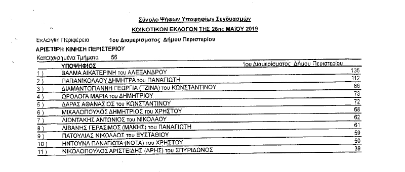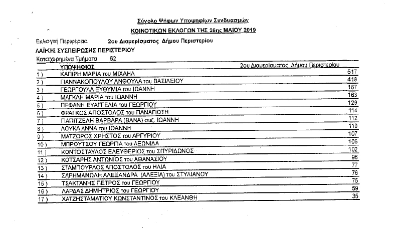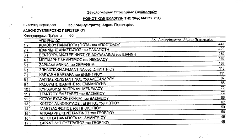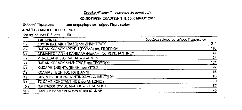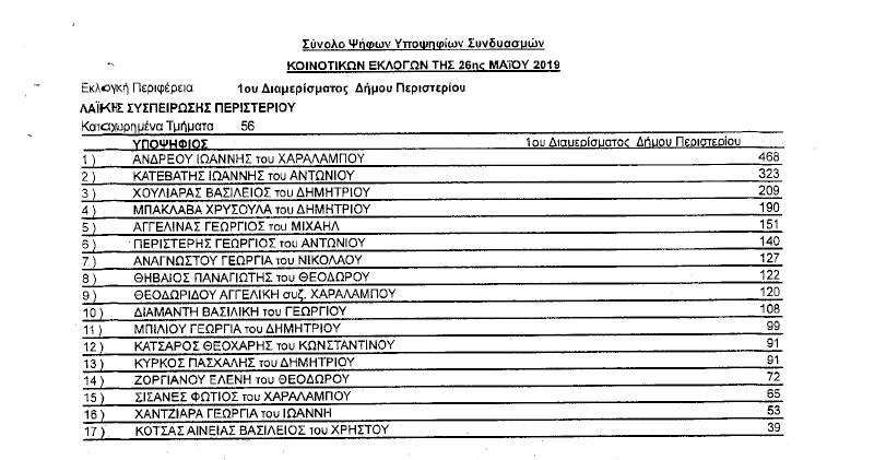 Ανακοινώθηκαν από το πρωτοδικείο τα επίσημα αποτελέσματα των υποψήφιων διαμερισματικών συμβούλων στο Δήμο Περιστερίου.