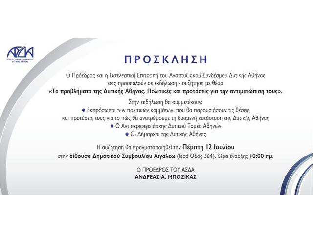 Ο Αναπτυξιακός Σύνδεσμος Δυτικής Αθήνας διοργανώνει την Πέμπτη 12 Ιουλίου και ώρα 10.00 στην αίθουσα Δημοτικού Συμβουλίου Αιγάλεω (Ιερά Οδός 364), εκδήλωση – συζήτηση με θέμα: «Τα προβλήματα της Δυτικής Αθήνας. Πολιτικές και προτάσεις για την αντιμετώπισή τους».