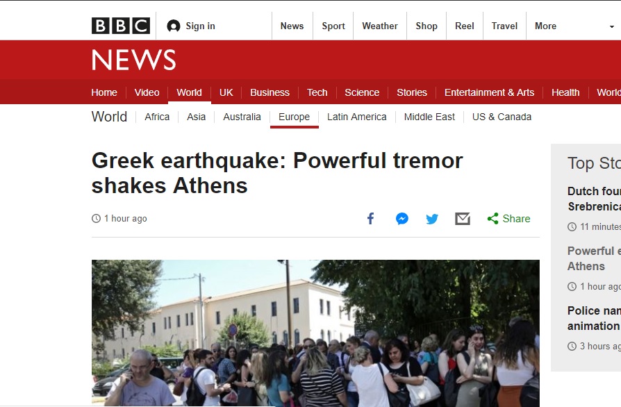 Δεύτερο θέμα στην ιστοσελίδα του BBC ήταν ο σεισμός στην Αθήνα. Ο ανταποκριτής του βρετανικού δικτύου σημειώνει ότι «ισχυρός σεισμός ταρακούνησε την ελληνική πρωτεύουσα διακόπτοντας τα τηλεφωνικά δίκτυα και την ηλεκτροδότηση σε τμήματα της πόλης» ενώ «οι Αθηναίοι έτρεξαν στους δρόμους και εκκένωσαν τα ψηλά κτίρια». Επισημαίνει ότι δεν έχουν αναφερθεί σοβαροί τραυματισμοί, παρά μόνο καμιά δωδεκαριά εγκλωβισμοί σε ανελκυστήρες, λόγω της διακοπής του ρεύματος.