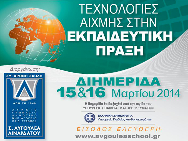 H Σύγχρονη Σχολή Σ. Αυγουλέα-Λιναρδάτου για 5η συνεχή χρονιά και υπό την αιγίδα του Υπουργείου Παιδείας & Θρησκευμάτων, πραγματοποιεί την ιδιαίτερα επιτυχημένη διημερίδα «Τεχνολογίες αιχμής στην εκπαιδευτική πράξη» η οποία θα λάβει χώρα στις 15 & 16 Μαρτίου 2014, στις εγκαταστάσεις των εκπαιδευτηρίων στο Περιστέρι(Ελευθερίου Βενιζέλου 112-114).