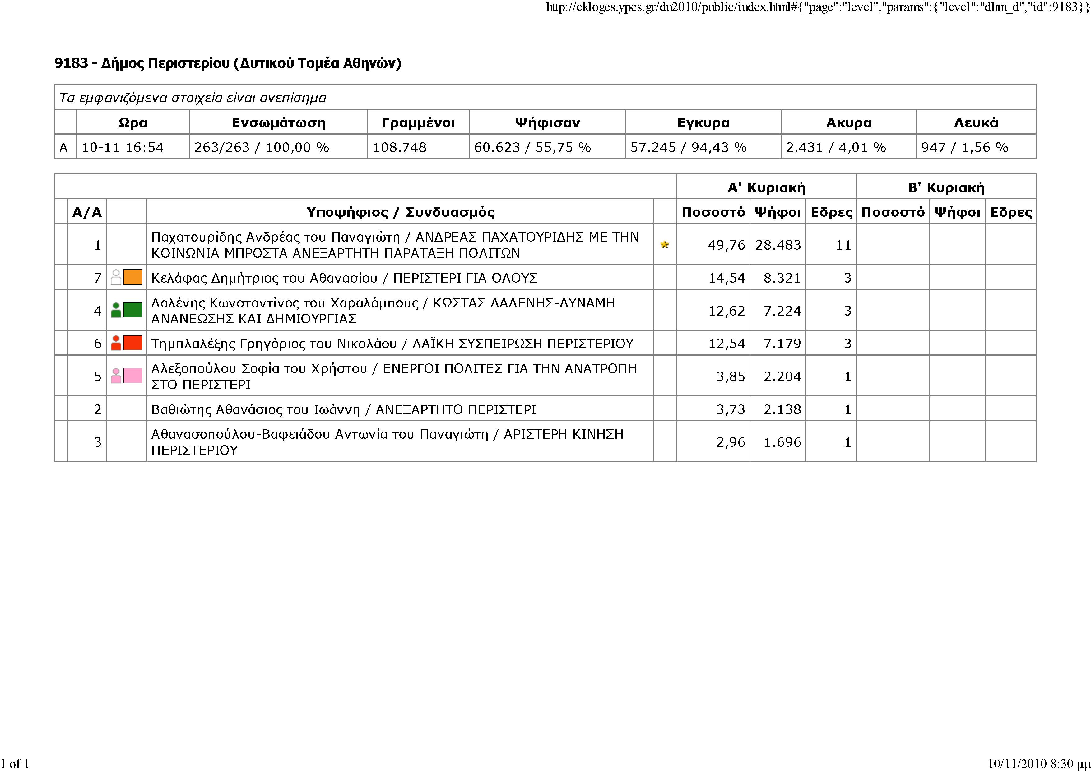 Έστω και με καθυστέρηση, το Υπουργείο Εσωτερικών σήμερα αργά το απόγευμα έδωσε τα τελικά αποτελέσματα των δημοτικών εκλογών στον Δήμο Περιστερίου και στα 263 εκλογικά τμήματα.