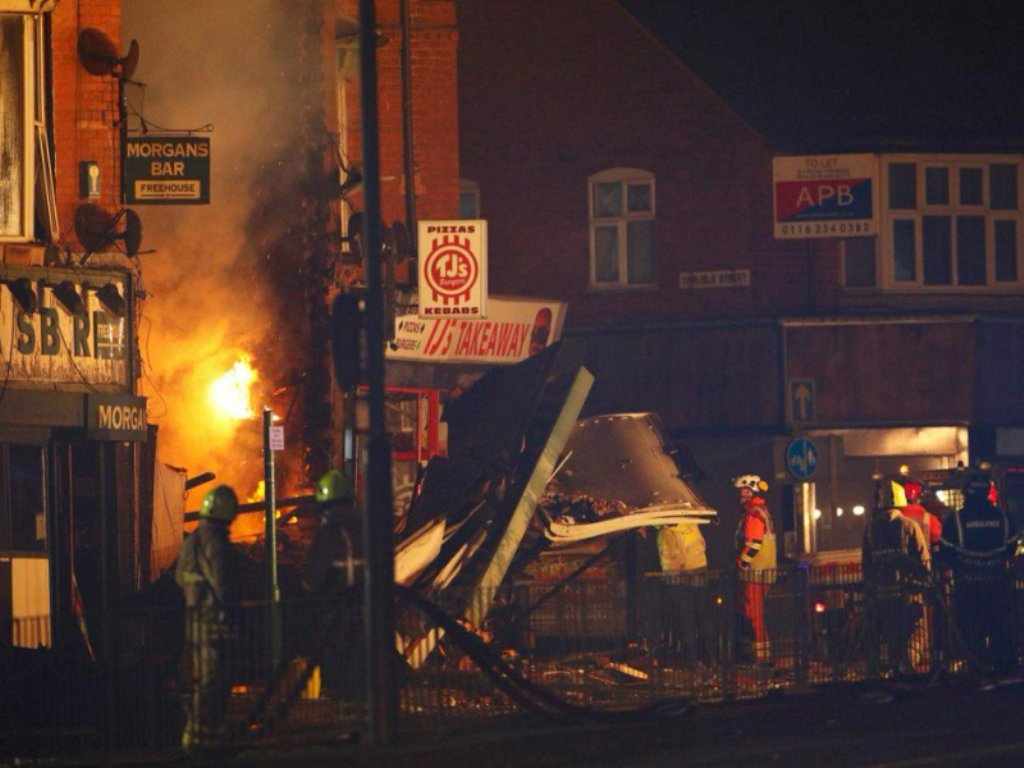 Η έκρηξη που σημειώθηκε σε κτίριο του Λέστερ και η πυρκαγιά που ξέσπασε στη συνέχεια κατέστρεψαν ένα παντοπωλείο που βρισκόταν στο ισόγειο όπως και τη διώροφη κατοικία από πάνω του.