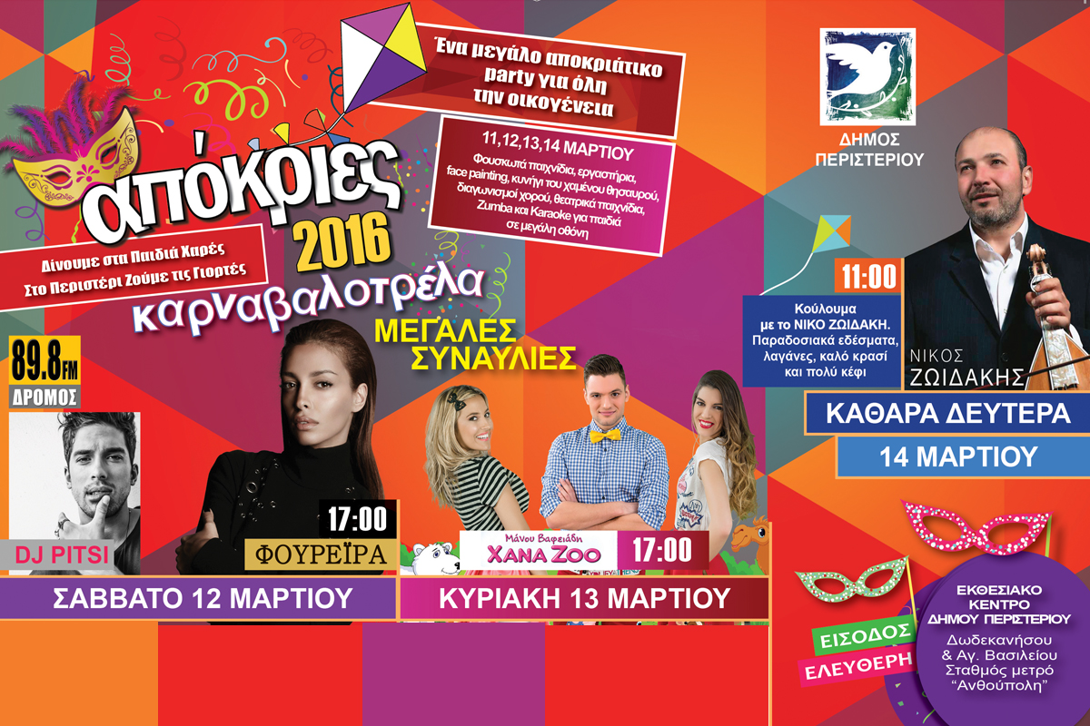 Από το πρόγραμμα εκδηλώσεων ξεχωρίζουν το Σάββατο 12 Μαρτίου η μεγάλη συναυλία της Φουρέιρα και του Dj Pitsi, ενώ την Κυριακή 13 Μαρτίου οι Xanazoo θα ξεσηκώσουν τους μικρούς Περιστεριώτες με τα τραγούδια τους.