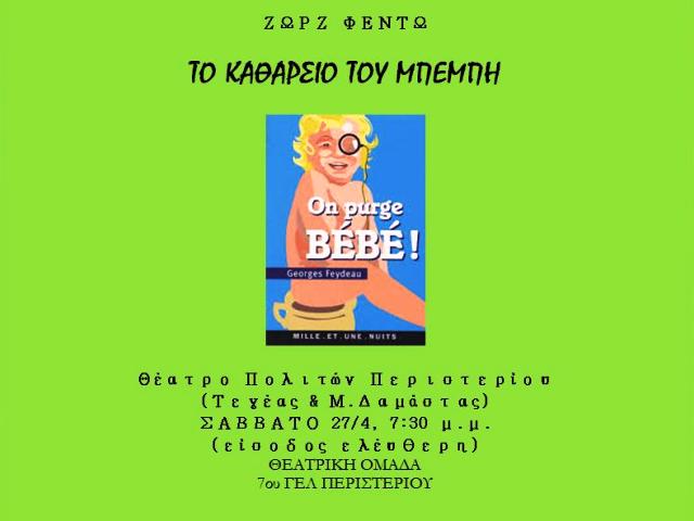 Ο Σύλογος Εργαζομένων Δήμου Περιστερίου καλεί στη θεατρική παράσταση του ΖΩΡΖ ΦΕΝΤΩ, ΤΟ ΚΑΘΑΡΣΙΟ ΤΟΥ ΜΠΕΜΠΗ, το Σάββατο 27 Απριλίου στις 7:30 μ.μ., από την θεατρική ομάδα του 7ου ΓΕΛ Περιστερίου.