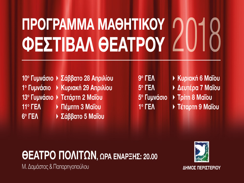 Στο πλαίσιο του Θεατρικού Φεστιβάλ Δευτεροβάθμιας Εκπαίδευσης Δήμου Περιστερίου, ερασιτεχνικές θεατρικές ομάδες των γυμνασίων και λυκείων θα παρουσιάσουν ξεχωριστές παραστάσεις στο Θέατρο Πολιτών (Τεγέας και Δαμάστας). Ώρα έναρξης 20:00. Είσοδος ελεύθερη.
