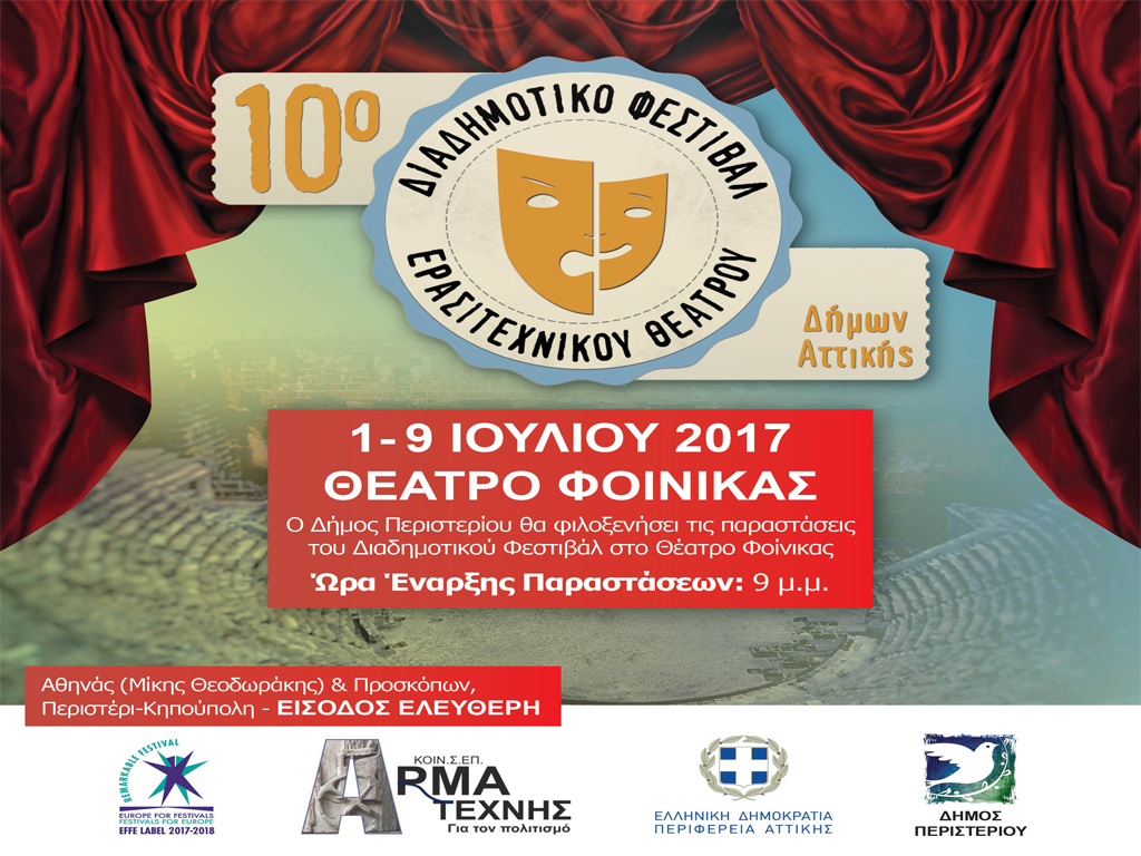 Στο πλαίσιο του 10ου Διαδημοτικού Φεστιβάλ Ερασιτεχνικού Θεάτρου Δήμων Αττικής, που συμμετέχει ο Δήμος Περιστερίου με τη θεατρική του ομάδα, θα πραγματοποιηθούν θεατρικές παραστάσεις στο Θέατρο Φοίνικας, από 1 έως 9 Ιουλίου 2017. Είσοδος Ελεύθερη!