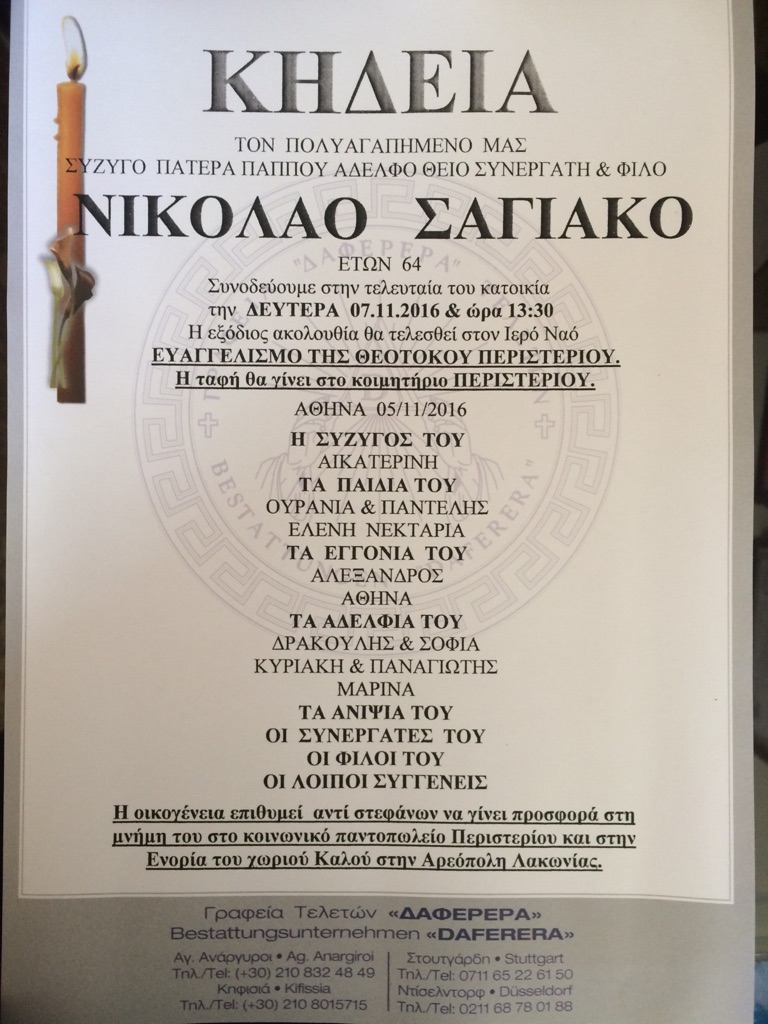 Η οικογένεια του Νίκου Σαγιάκου επιθυμεί αντί στεφάνων να γίνει προσφορά στη μνήμη του, στο σύλλογο γονιών παιδιών με νεοπλασματική ασθένεια «Φλόγα», στην Ενορία του χωριού Καλού στην Αρεόπολη Λακωνίας και στο Κοινωνικό Παντοπωλείο του Δήμου Περιστερίου.