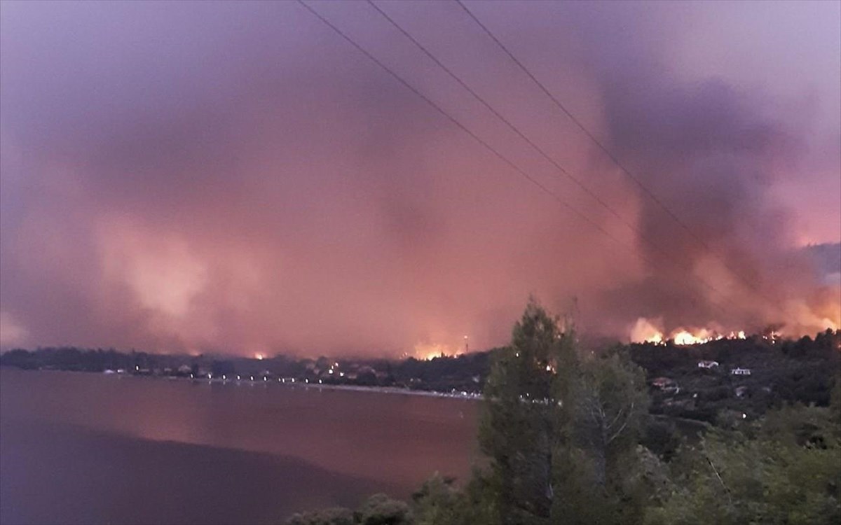 Από την πλευρά του Αιγαίου, μετά την Κήρινθο ένα μέτωπο της φωτιάς κινείται προς το Μαντούδι ενώ οι άνεμοι στρέφουν τις φλόγες προς τη Ζωοδόχο Πηγή όπου εκεί δίδεται η μάχη.