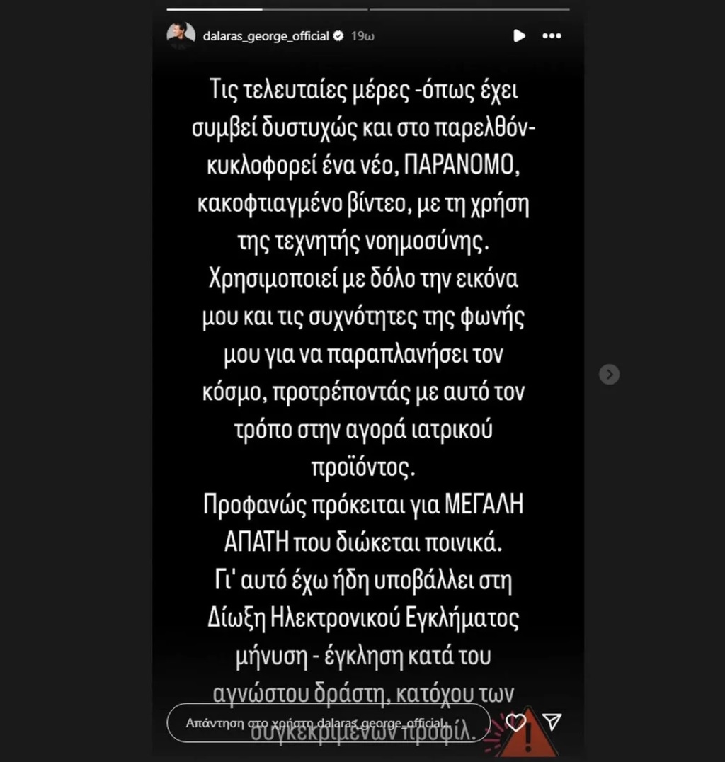 Με ανάρτησή του στα social media, ο Γιώργος Νταλάρας έπεσε θύμα διαδικτυακής απάτης, καθώς χρησιμοποιήθηκε η εικόνα του και η φωνή του για την προώθηση ιατρικού προϊόντος, χωρίς ο ίδιος να το γνωρίζει.