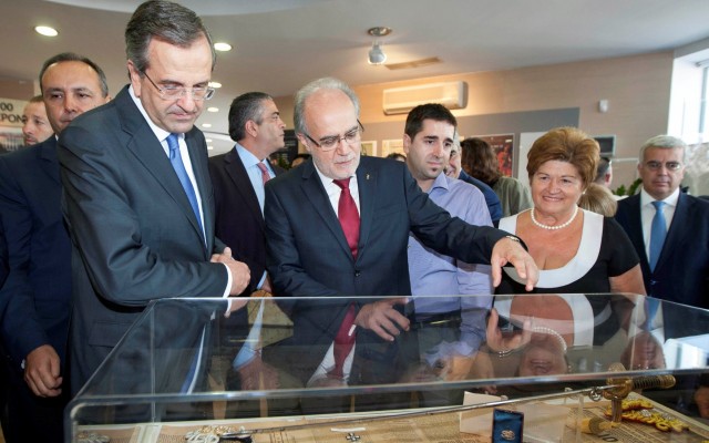 Πρώτη στάση του κ. Σαμαρά ήταν στην «Έκθεση Κειμηλίων Απελευθέρωσης» της περιόδου 1912 – ’13, στο περίπτερο του υπουργείου Μακεδονίας – Θράκης, όπου ξεναγήθηκε από τον υπουργό Θεόδωρο Καράογλου.