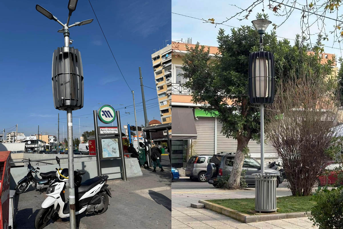 Περαστικοί σε κεντρικά σημεία στο Περιστέρι βλέπουν τα εξαρτήματα που έχουν τοποθετηθεί σε κολώνες φωτισμού και αναρωτιούνται τι είναι.