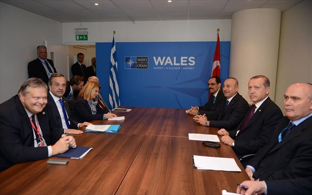 Τις πάγιες ελληνικές θέσεις πρόβαλε ο πρωθυπουργός, Αντώνης Σαμαράς, στη συνάντηση που είχε με τον πρόεδρο της Τουρκίας, Ταγίπ Ερντογάν, στο περιθώριο της Συνόδου Κορυφής του ΝΑΤΟ, στο Νιούπορτ, τονίζοντας ότι δεν πρέπει με τις πράξεις και τις δηλώσεις μας να δημιουργούμε περιβάλλον που δηλητηριάζει τις σχέσεις μας.
