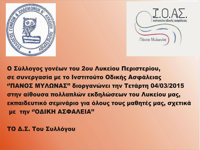 Ο Σύλλογος γονέων του 2ου Λυκείου Περιστερίου, σε συνεργασία με το Ινστιτούτο Οδικής Ασφάλειας “ΠΑΝΟΣ ΜΥΛΩΝΑΣ” διοργανώνει την Τετάρτη 4 Μαρτίου στην αίθουσα πολλαπλών εκδηλώσεων του Λυκείου, εκπαιδευτικό σεμινάριο για όλους τους μαθητές του σχολείου, σχετικά με την “ΟΔΙΚΗ ΑΣΦΑΛΕΙΑ”.