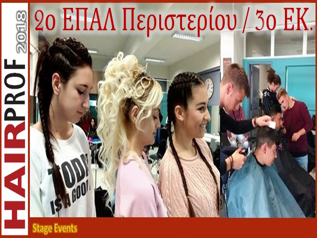 Οι σπουδαστές κομμωτικής του 3ου Εργαστηριακού Κέντρου Περιστερίου παρουσίασαν στο stage της HAIRPROF (Επαγγελματική Έκθεση Κομμωτηρίου) αντρικά κουρέματα freestyle/pompadour/razor fade/crop και καλλιτεχνικά χτενίσματα που συνδυάζουν το ροκ στυλ με το κλασικό.