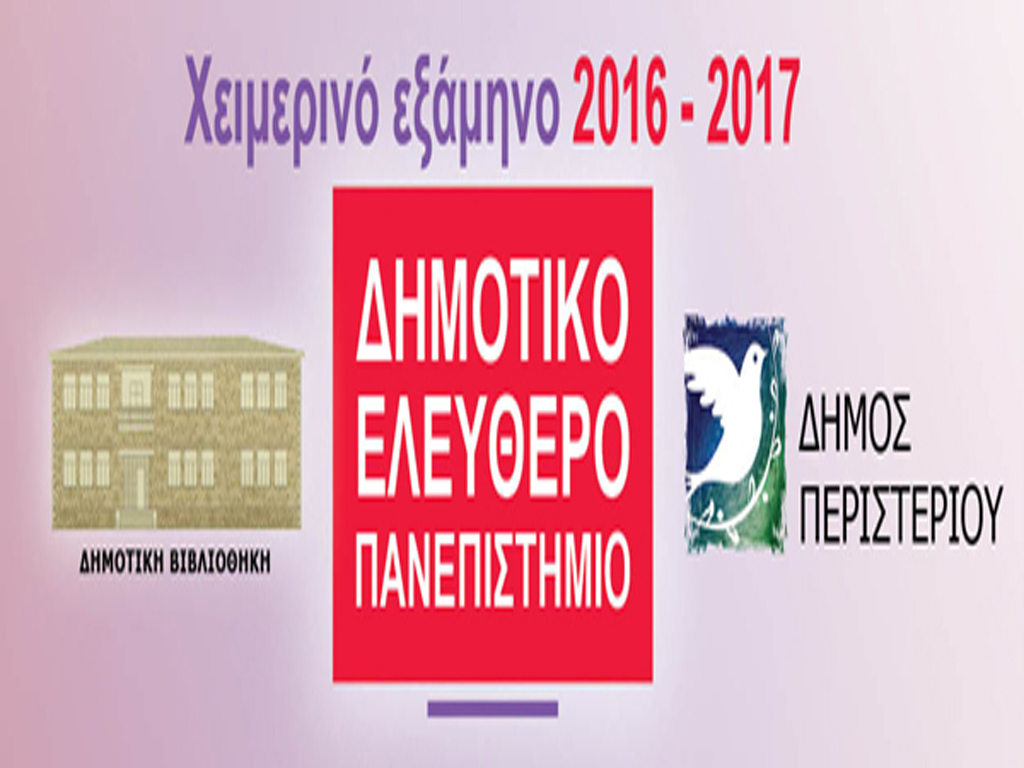Το Δημοτικό Ελεύθερο Πανεπιστήμιο Περιστερίου ανοίγει τις πύλες του με την έναρξη του Χειμερινού Εξαμήνου, που θα διαρκέσει από τον Οκτώβριο 2016 έως τον Ιανουάριο του 2017. Το πρόγραμμα αφορά δύο θεματικούς κύκλους: 1ος Κοινωνιολογία, Λαογραφία, Λογοτεχνία & 2ος Ιστορία, Ψυχολογία, Φιλολογία.