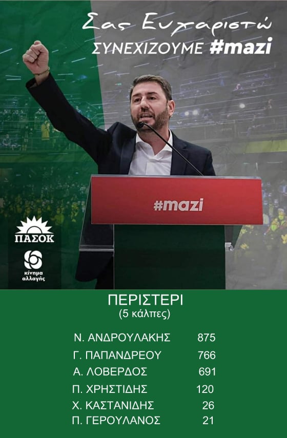 Σύμφωνα με την καταμέτρηση στο Περιστέρι ο Νίκος Ανδρουλάκης έλαβε 875 ψήφους, με δεύτερο τον Γιώργο Παπανδρέου με 766 ψήφους.