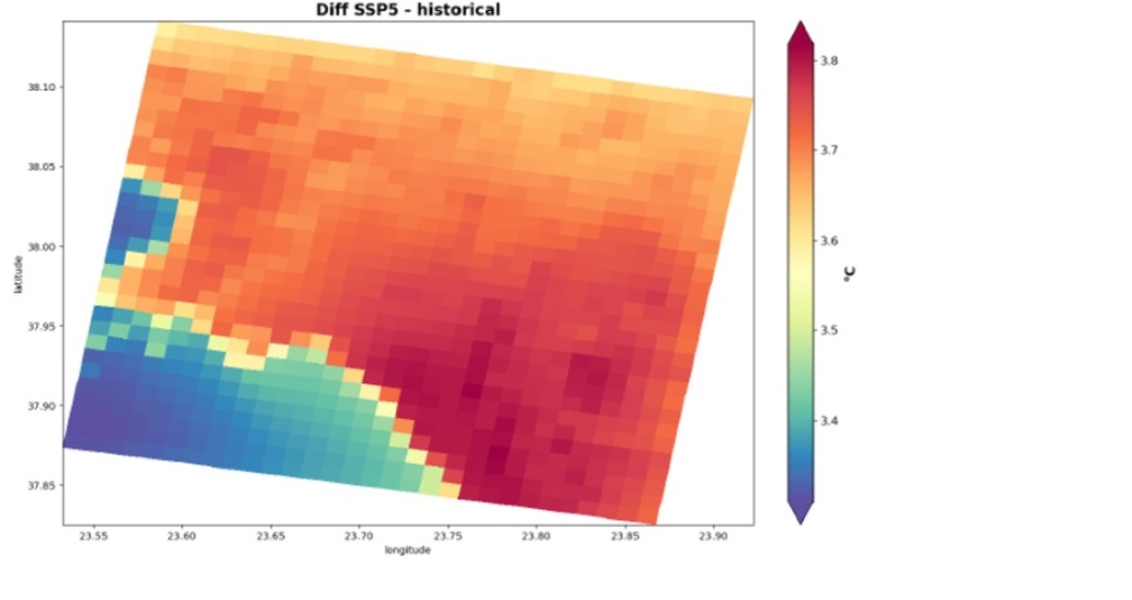 Παράλληλα εκτιμήθηκε και η διαφορά θερμοκρασίας για τη χρονική περίοδο 2041-2070 σε σύγκριση με την περίοδο 1971 – 2000 με τη χρήση του σεναρίου SSP5-8.5 που εντάσσεται στη νέα σειρά σεναρίων των Ηνωμένων Εθνών για την Κλιματική Αλλαγή και είναι το δυσμενέστερο (ουσιαστικά θεωρεί ότι θα συνεχιστεί αμείωτη η χρήση των ορυκτών καυσίμων και κατά συνέπεια θα αυξηθεί περαιτέρω η συγκέντρωση των αερίων θερμοκηπίου, και ιδίως του διοξειδίου του άνθρακα, στην ατμόσφαιρα).