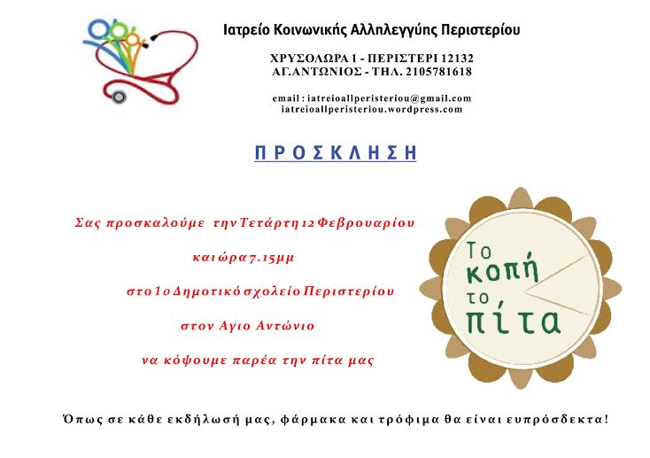 Το Ιατρείο Κοινωνικής Αλληλεγγύης Περιστερίου σας καλεί στην εκδήλωση κοπής πίτας που θα λάβει χώρα στο 1ο Δημοτικό σχολείο Περιστερίου , δίπλα στον Αγιο Αντώνιο , την Τετάρτη 12 Φεβρουαρίου στις 7.15 μ.μ