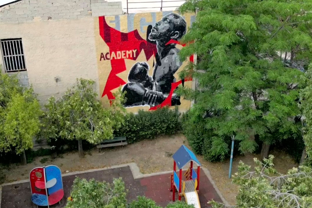 Από σήμερα όμως στο Περιστέρι θα φιλοξενείται και το μεγαλύτερο πυγμαχικό γκράφιτι που έχει γίνει στην Ελλάδα. Το έργο έχει ύψος 8μ και ξεπερνά τα 50 τ.μ. Την τοιχογραφία επιμελήθηκε ο καλλιτέχνης Spent1 από την Αθήνα και το αποτέλεσμα είναι πραγματικά εντυπωσιακό.