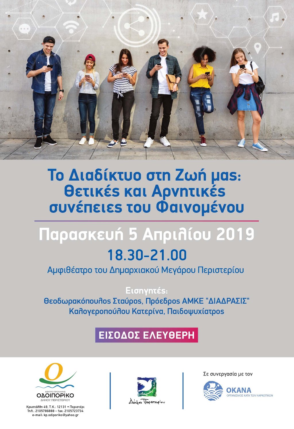 Το Κέντρο Πρόληψης των Εξαρτήσεων & Προαγωγής της Ψυχοκοινωνικής Υγείας Δήμου Περιστερίου “ΟΔΟΙΠΟΡΙΚΟ” πραγματοποιεί ημερίδα, με θέμα: “Το Διαδίκτυο στη Ζωή μας: Θετικές και Αρνητικές συνέπειες του Φαινομένου”.