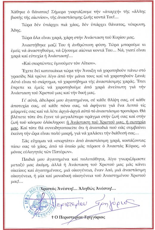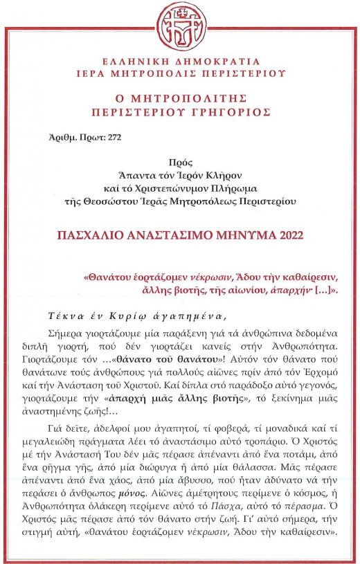 Το δικό του μήνυμα ενόψει της Μεγάλης Βδομάδας και του Πάσχα εξέδωσε ο Σεβασμιότατος Μητροπολίτης Περιστερίου κ. Γρηγόριος.