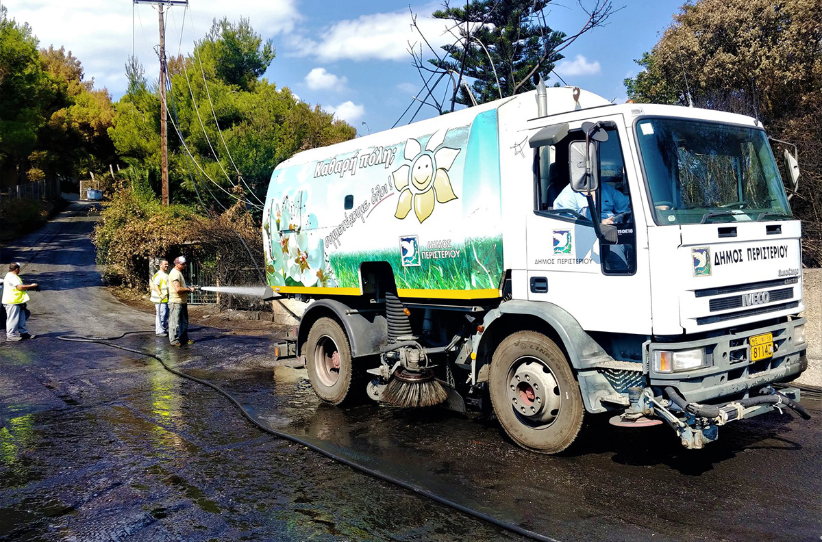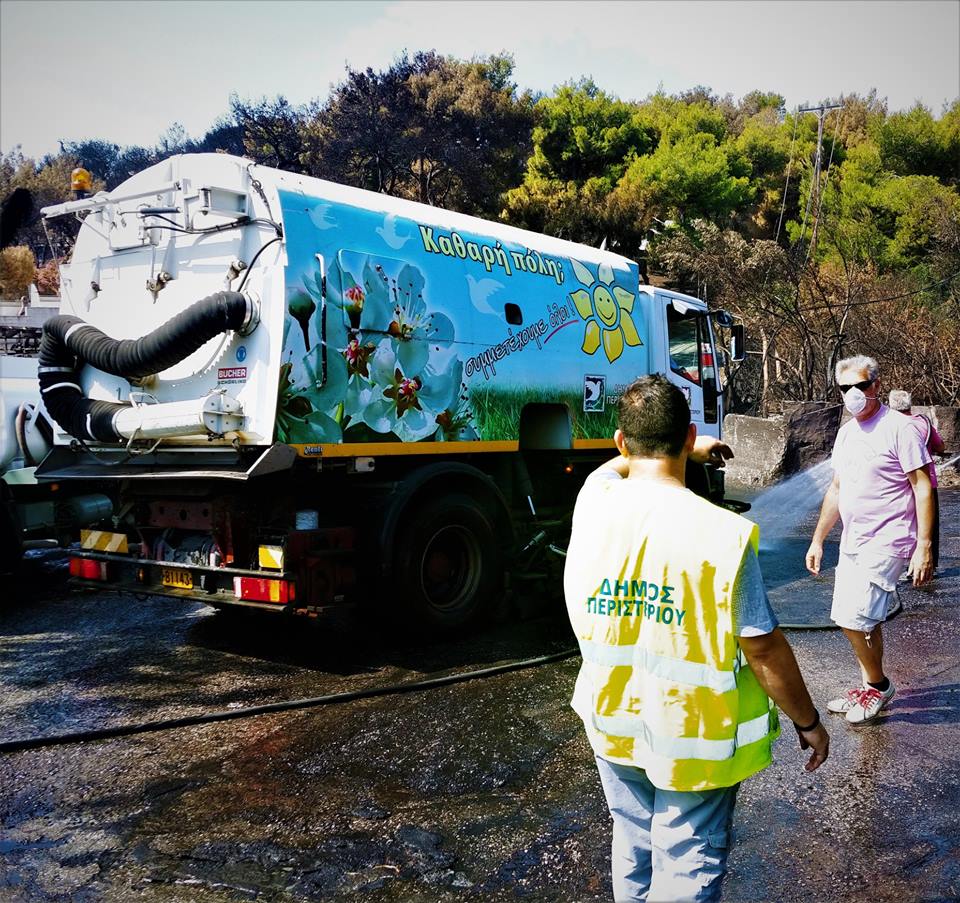 Μαζί με την ενίσχυση μέσω προϊόντων ο Δήμος Περιστερίου διαθέτει όλες αυτές τις μέρες οχήματα του στόλου του και κυρίως υδροφόρες και σκούπες ώστε να καθαριστεί όσο το δυνατόν πιο άμεσα η πληγείσα περιοχή Μάτι.