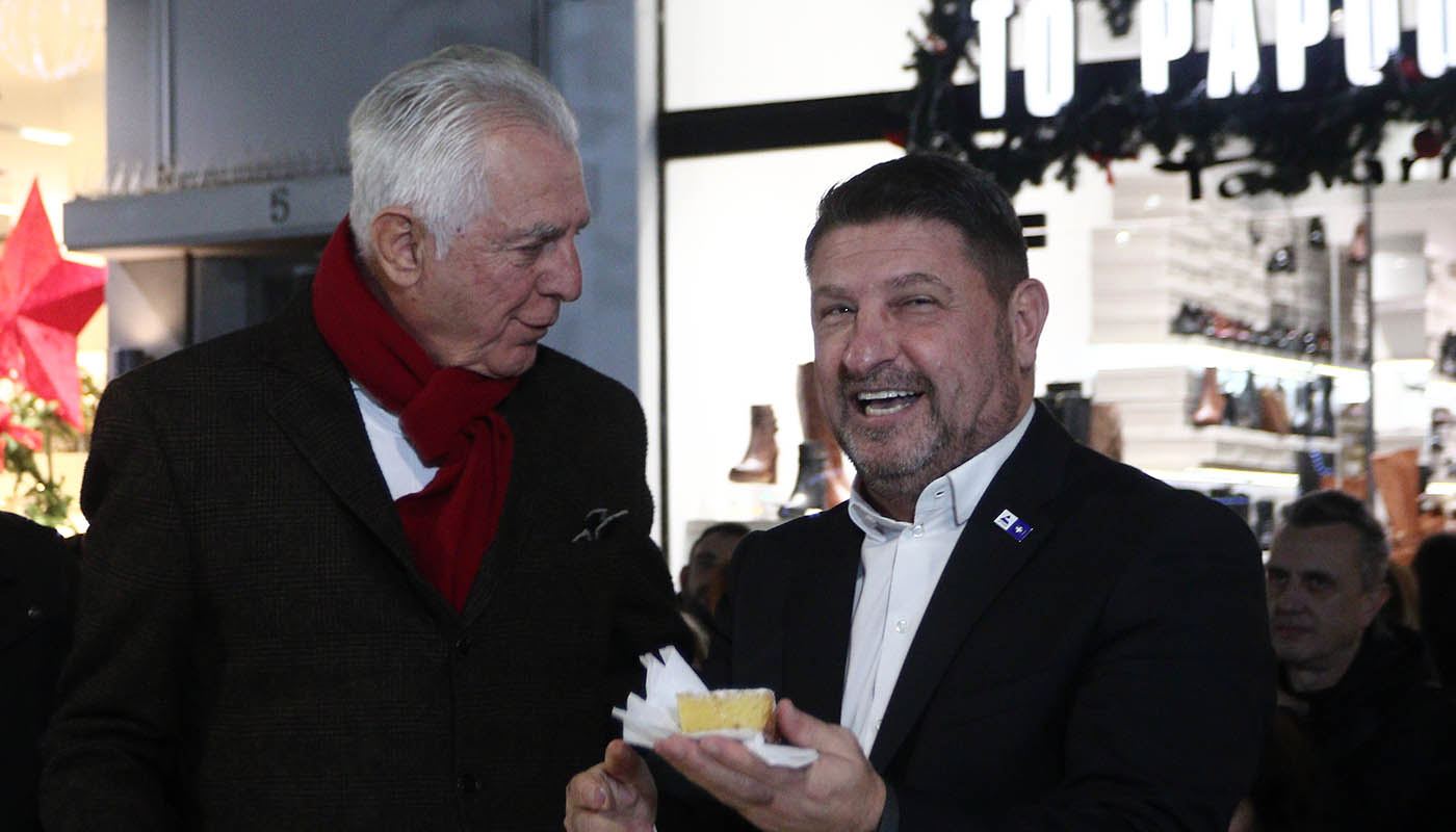 Τα πρώτα κομμάτια της εντυπωσιακής Βασιλόπιτας έκοψαν ο Δήμαρχος Περιστερίου, Ανδρέας Παχατουρίδης, και ο Περιφερειάρχης Αττικής, Νίκος Χαρδαλιάς, δίνοντας το σύνθημα για τη διανομή της στον κόσμο που είχε γεμίσει ασφυκτικά τον πεζόδρομο και την πλατεία.