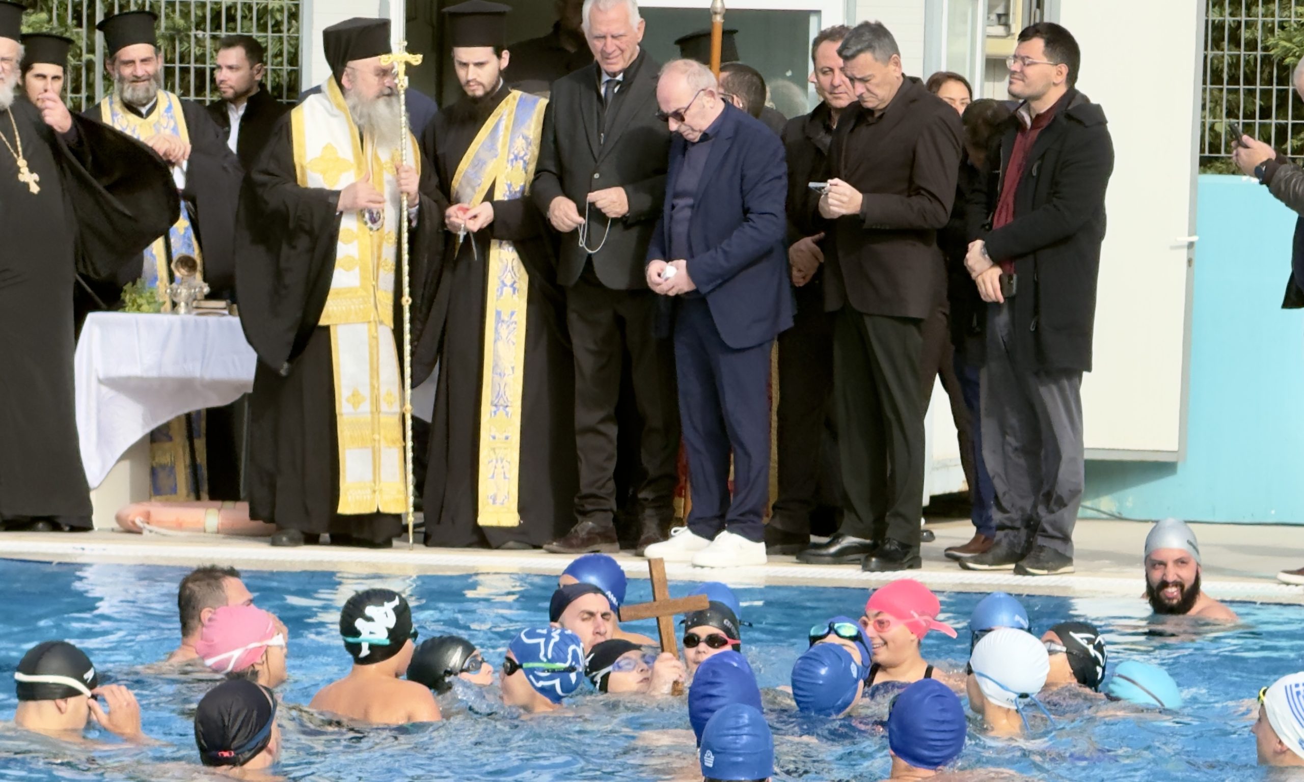 Κατά το «Εν Ιορδάνη βαπτιζομένου σου Κύριε…» μικροί και μεγάλοι βούτηξαν στην πισίνα για να λάβουν την ευλογία του Σταυρού καταχειροκροτούμενοι από τους Περιστεριώτες που βρέθηκαν στο κολυμβητήριο.