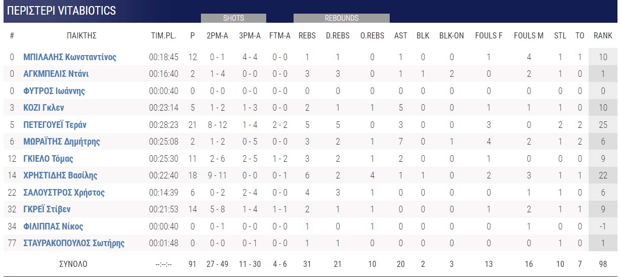 Για το Λαύριο, που έγραψε τον επίλογο στη φετινή σεζόν, ο Δημήτρης Κακλαμανάκης είχε 22 πόντους και 121 ριμπάουντ, ενώ ο Βασίλης Μουράτος έκανε θραύση στη δημιουργία, με 16 ασίστ (αλλά και 14 πόντους).