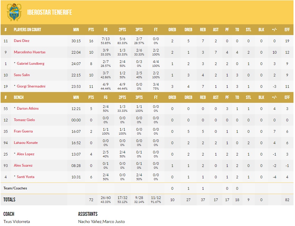 Οι δυο ομάδες συμβάδιζαν στο σκορ στην πρώτη περίοδο της αναμέτρησης στο Santiago Martin, εκεί όπου ο Σκούτσι Σμιθ σκόραρε πίσω από τα 6μ.75 για το 10-13 στο 7:55 όμως η Τενερίφη έτρεξε σερί 15-0 για το 25-13 με το τρίποντο του Ντάνι Ντίεθ στο 12:15!