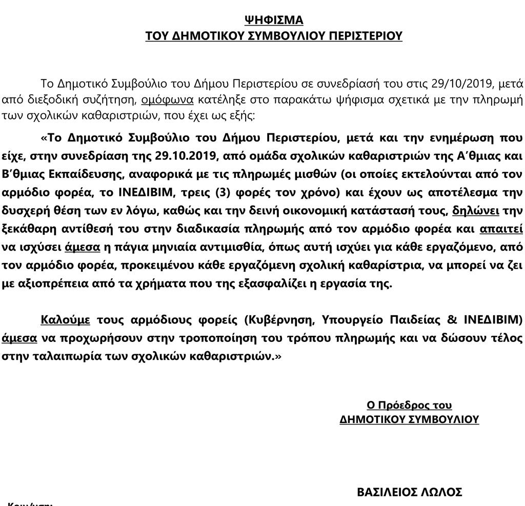 Με ομόφωνο ψήφισμα το Δημοτικό Συμβούλιο Περιστερίου απαιτεί την πληρωμή των σχολικών καθαριστριών σε πάγια μηνιαία αντιμισθία.