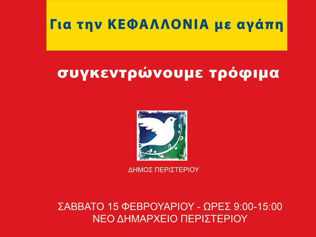 Μεγάλη εκστρατεία αλληλεγγύης “Με αγάπη για την Κεφαλλονιά συγκεντρώνουμε τρόφιμα” θα πραγματοποιήσει ο Δήμος Περιστερίου, το Σάββατο 15 Φεβρουαρίου 2014 και ώρες 9:00-15:00 στο νέο Δημαρχείο (πλατεία Δημοκρατίας – σταθμό Μετρό “Περιστέρι”).