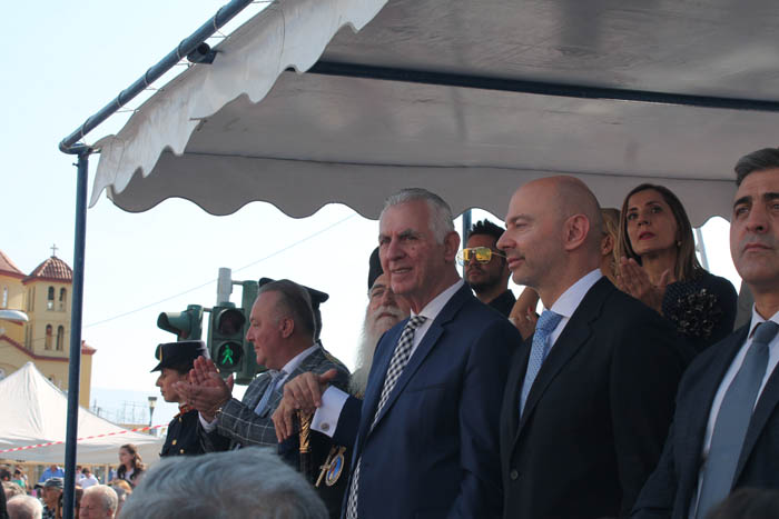 Φέτος για πρώτη φορά μετά από πολύ καιρό οι επίσημοι ανέβηκαν στην εξέδρα και η γαλανόλευκη σημαία με τις ιέρειες τοποθετήθηκε μπροστά τους.