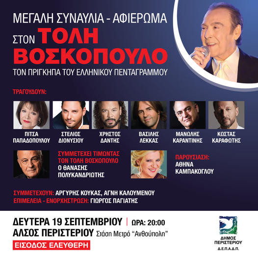 Στη συναυλία θα συμμετέχει τιμώντας τον Τόλη Βοσκόπουλο και ο Θανάσης Πολυκανδριώτης όπως επίσης και οι Αργύρης Κούκας Αγνή Καλούμενου.