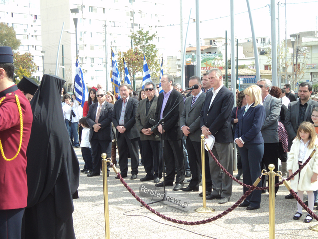Η εκδήλωση τιμής για τους ήρωες ολοκληρώθηκε με τη τήρηση ενός λεπτού σιγής και τον Εθνικό Ύμνο από τη Φιλαρμονική του Δήμου Περιστερίου.