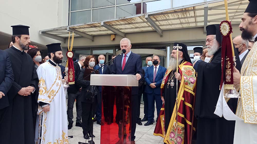 Ο Δήμαρχος Περιστερίου, Ανδρέας Παχατουρίδης κατά την ομιλία του για το νέο Μητροπολίτη της πόλης με την ολοκλήρωσή της του χάρισε τον Τίμιο Σταυρό.