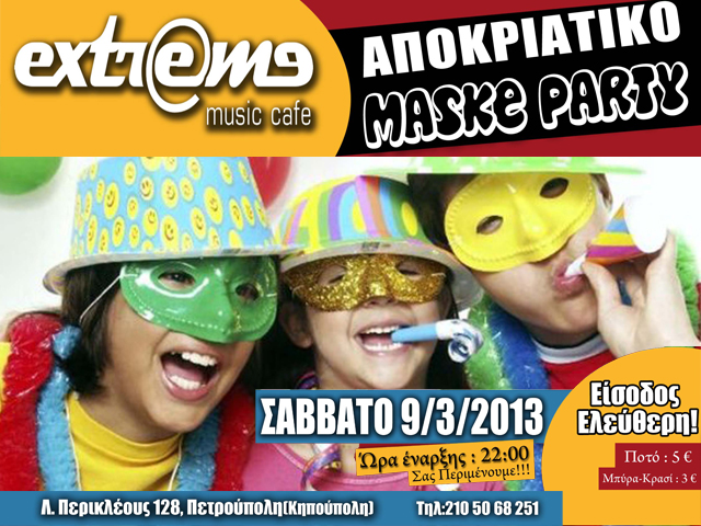 Οι Απόκριες μπορεί να άργησαν λίγο φέτος, στο Extreme Café όμως τις γιορτάζουμε αυτό το Σάββατο με ένα ξέφρενο μασκέ πάρτυ!