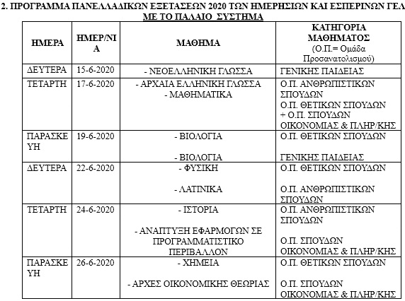 Οι υποψήφιοι των ΓΕΛ που θα δώσουν με το ΠΑΛΙΟ σύστημα, θα έχουν κατά βάση κοινό πρόγραμμα με όσους δώσουν με το νέο. Εξαίρεση, στις 22/6 θα πραγματοποιηθεί η εξέταση των Λατινικών (ΟΠ Ανθρωπιστικών Σπουδών), στις 24/6 η εξέταση του μαθήματος «Ανάπτυξη Εφαρμογών σε Προγραμματιστικό Περιβάλλον» (ΟΠ Σπουδών Οικονομίας και Πληροφορικής) και στις 26/6 η εξέταση του μαθήματος «Αρχές Οικονομικής Θεωρίας» (ΟΠ Σπουδών Οικονομίας και Πληροφορικής).