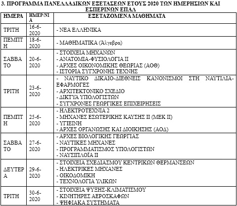 Ανακοινώθηκε το πρόγραμμα των Πανελλαδικών Εξετάσεων 2020, μία ημέρα αφότου έγινε γνωστή η ημερομηνία έναρξής τους, στις 15 Ιουνίου για τα Γενικά Λύκεια και στις 16 Ιουνίου για τα Επαγγελματικά.