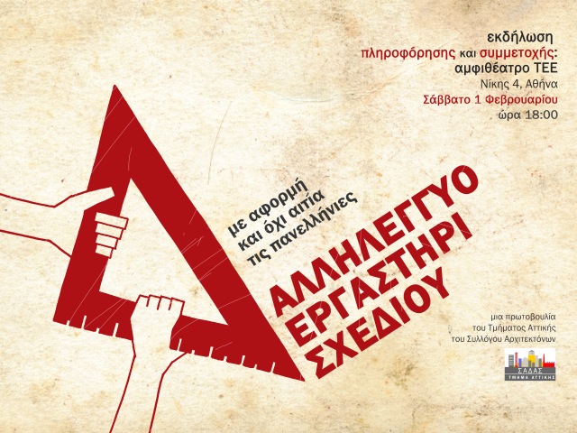 Η Εναρκτήρια Εκδήλωση Αλληλέγγυου Εργαστηρίου Σχεδίου θα πραγματοποιηθεί το Σάββατο 01.02.2014, ώρα 18:00, στην Αίθουσα Εκδηλώσεων του ΤΕΕ (1ος όροφος), Νίκης 4, Αθήνα