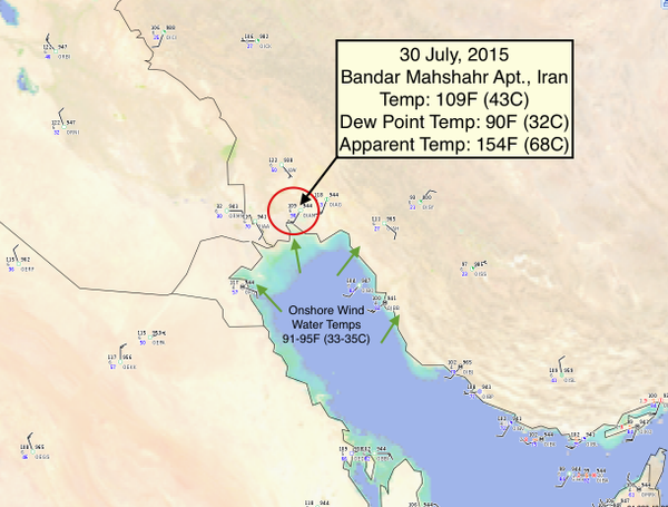 Ο συνδυασμός της υγρασίας και της πολύ υψηλής θερμοκρασίας κάνει την αίσθηση του αέρα να αγγίζει τους 67,8 Κελσίου, ενω η πραγματική θερμοκρασία του αέρα είναι 42,8 βαθμούς Κελσίου, αλλά ο συνδυασμός με την υγρασία δημιουργούν αίσθηση που ξεπερνά τους 60 βαθμούς.