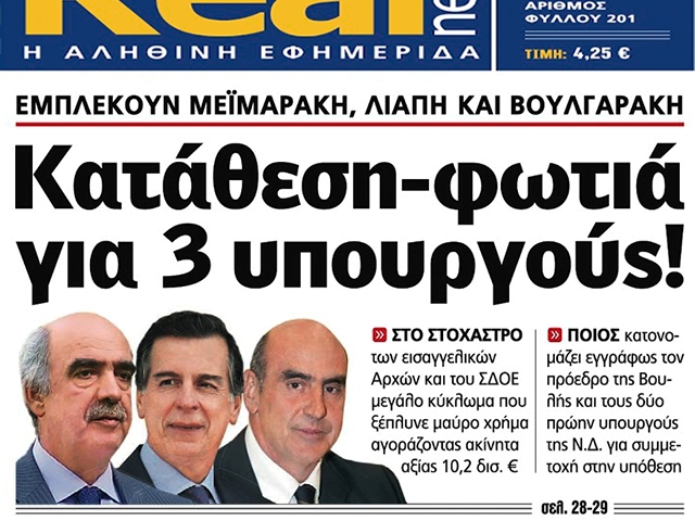 Βαριές κατηγορίες κατά τριών πρώην υπουργών της ΝΔ, σύμφωνα με το δημοσίευμα που εμπλέκει σε υπόθεση για ξέπλυμα μαύρου χρήματος τους πρώην υπουργούς Μιχάλη Λιάπη και Γιώργο Βουλγαράκη, αλλά και τον πρόεδρο της Βουλής Ευάγγελο Μεϊμαράκη.