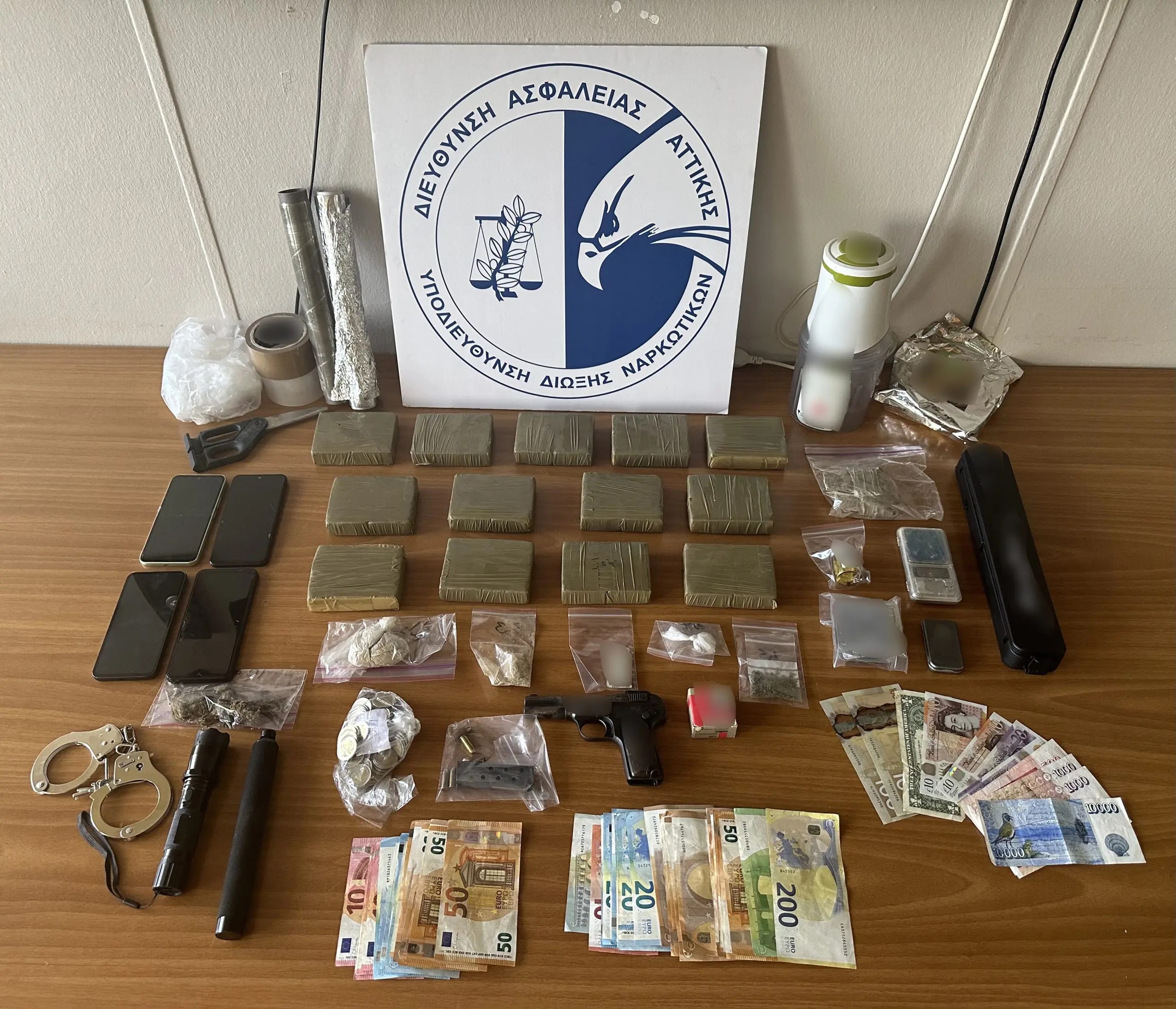 Από έρευνα που πραγματοποιήθηκε, εντοπίστηκαν, μεταξύ άλλων, και κατασχέθηκαν: Πιστόλι με 27 φυσίγγια, 3 κιλά και 380 γραμμάρια ηρωίνης, 11,5 γραμ. ακατέργαστης κάνναβης, 79 φαρμακευτικά δισκία, συσκευή ηλεκτρικής εκκένωσης (taser) και τα χρηματικά ποσά των 1.825 ευρώ, 14.000 κορωνών Ισλανδίας, 200 δολαρίων Καναδά και 60 λιρών Ηνωμένου Βασιλείου.