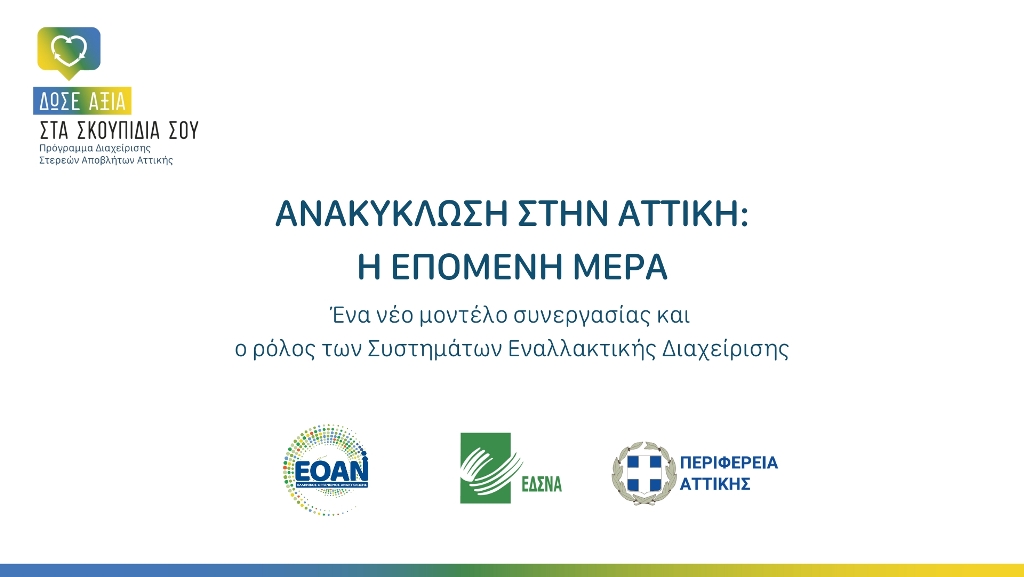 Η επόμενη Μέρα της Ανακύκλωσης στην Αττική συζητήθηκε σε εκδήλωση που διοργάνωσε ο ΕΔΣΝΑ, σε συνεργασία με την Περιφέρεια Αττικής και τον Ελληνικό Οργανισμό Ανακύκλωσης.