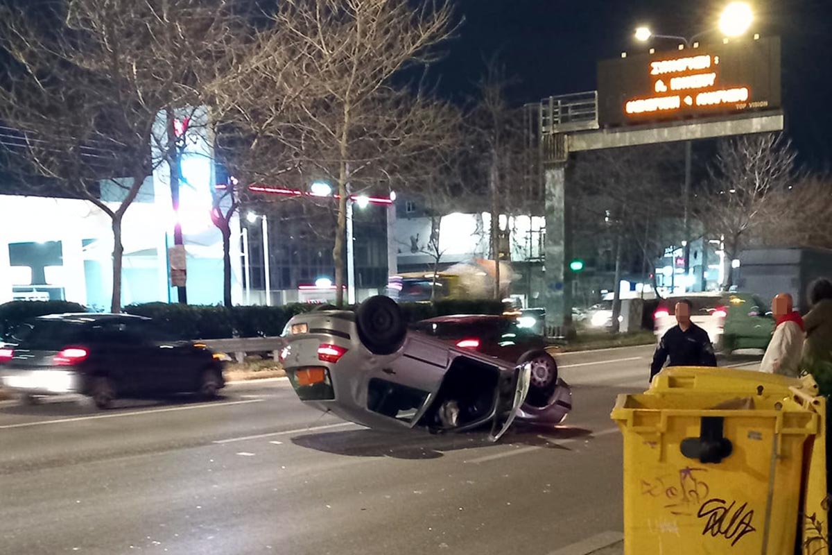 Κάτω από άγνωστες συνθήκες το ένα αυτοκίνητο αναποδογύρισε στη μέση της λεωφόρου ενώ το δεύτερο έχασε τον έλεγχο και καρφώθηκε σε ψυγείο περιπτέρου.