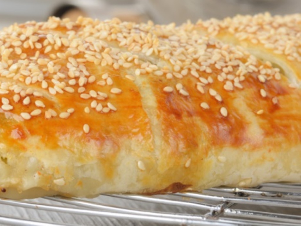 – Σε βουτυρωμένο ταψί ή πυρέξ τοποθετείτε το ένα φύλλο ζύμης, απλώνετε τη γέμιση και μετά το δεύτερο φύλλο.