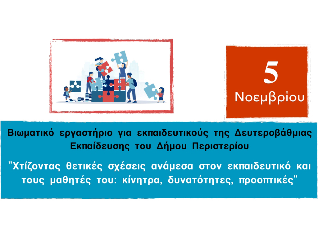 Το Κέντρο Πρόληψης των Εξαρτήσεων & Προαγωγής της Ψυχοκοινωνικής Υγείας Δήμου Περιστερίου “Οδοιπορικό” προσκαλεί τους εκπαιδευτικούς της Δευτεροβάθμιας Εκπαίδευσης να λάβουν μέρος στο βιωματικό εργαστήριο, που στόχο έχει την ανάδειξη των δυνατοτήτων της θετικής σχέσης ανάμεσα στον εκπαιδευτικό και τους μαθητές του.