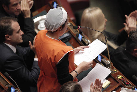 «Εάν βγάλουν τα στελέχη της κυβέρνησης Μόντι τα κουστούμια τους θα αποκαλυφθεί ότι φορούν τη στολή των εκπροσώπων των τραπεζών και των ισχυρών» δήλωσε η Ιταλίδα βουλευτής, Εμανουέλα Μουνεράτο, και πέταξε το παλτό της…